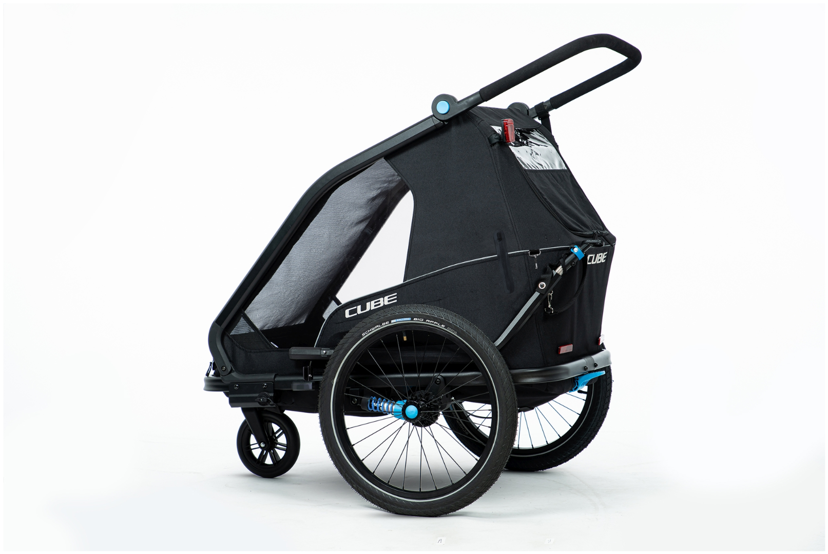 Art. NR: 1262818Der CUBE Fahrradanhänger Double CMPT ist der optimale Begleiter durch den Alltag. Das Multitalent besticht durch ausgeklügelte Funktionen als Fahrrad-Anhänger und Kinderwagen. Der große Insektenschutz an der Front und den Seiten hält ungewollte Fahrgäste vor dem Eindringen ab, ohne dabei die Frischluftzirkulation zu beeinflussen. Dank Sonnenschutz werden die kleinen Fahrgäste nicht bei ihren Nickerchen geblendet. Der Spritzschutz hält die Kids auch bei matschigen Fahrten trocken. Die Sitz- und Rückenpolster sowie Kopfpolster mit Helmpocket, machen die Fahrt für die Kleinen zum komfortablen Vergnügen. Die Federung ist individuell einstellbar, je nach Untergrund und Gewicht. Mit dem zusätzlich erhältlichen Jogger Kit lassen sich alle Ausflüge noch flexibler gestalten.