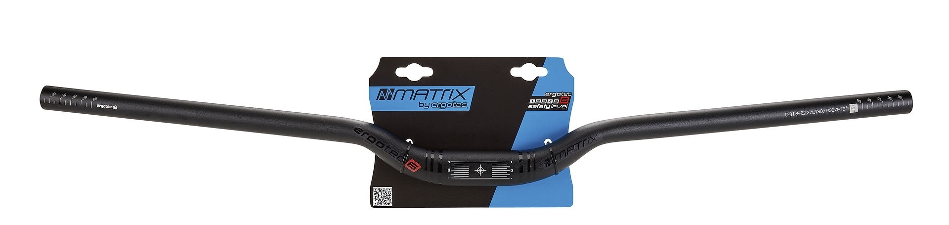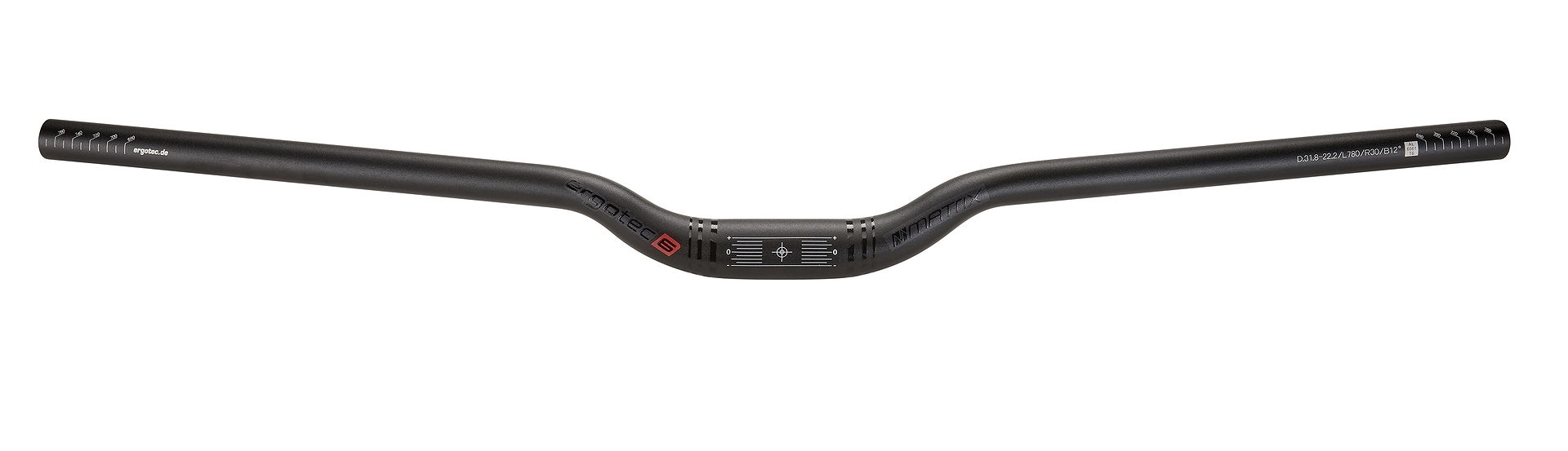 LangbeschreibungMTB Lenker<br>by ergotec<br>Wandstärke: 1,9-2,7-1,9<br>Grifflänge: 260 mm<br>Gewicht: ca. 395 g<br>Safetylevel: 6<br>max. zulässiges Gesamt-<br>gewicht ist der Safety- Tabelle<br>von Humpert zu entnehmen