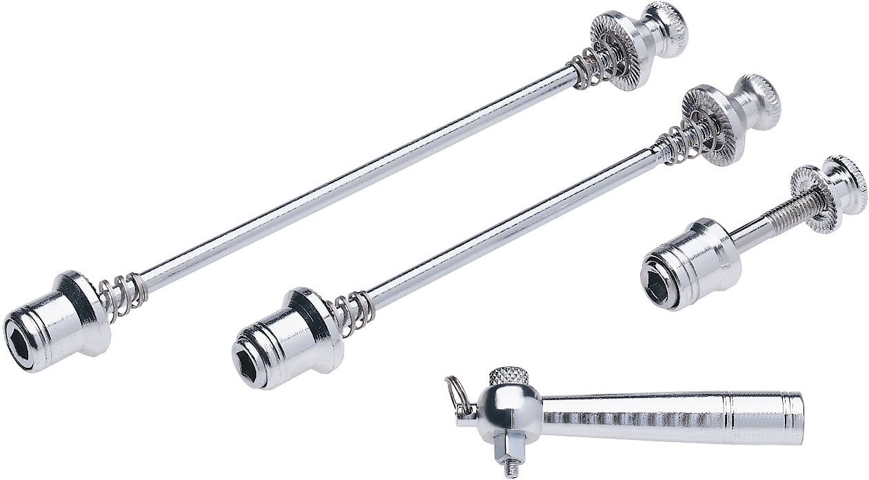 LangbeschreibungSet für Sattel/Laufräder<br>inkl. 5-kant Drehschlüssel<br>als Diebstahlschutz<br>Länge VR: 115 mm/100 mm<br>Länge HR: 151 mm/135 mm<br>Aluminium 6061- T6 mit CrMo-Achse<br>Gewicht: 101 g
