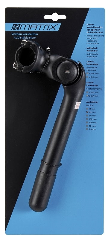 Langbeschreibungwinkelverstellbarer Schaftvorbau<br>für City/Trekking<br>4-Schrauben-Klemmung<br>offenes Kopfdesign<br>Material: Alu (Kopf)/Alu (Schaft)<br>geprüft nach ISO 4210-5City